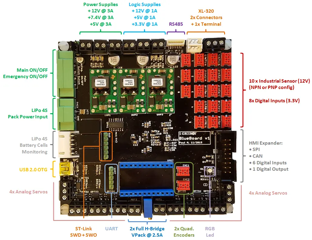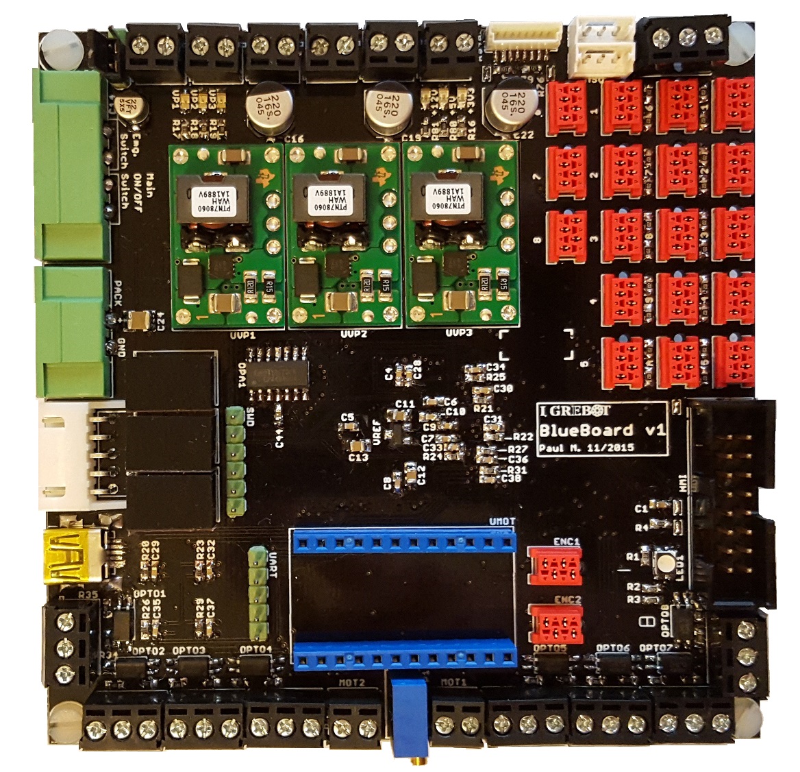 L'objectif du développement de cette carte "blueboard" est de disposer d'une électronique compacte et basée sur une seule carte unique permettant la gestion complète d'un robot autonome. Dans le contexte de la coupe de france de robotique, les développements précédents de l'association Igrebot employaient de multiples cartes (alimentation, gestion moteur, actionneurs ...) ce qui entrainait une certaine complexité de maintenance et un volume important.